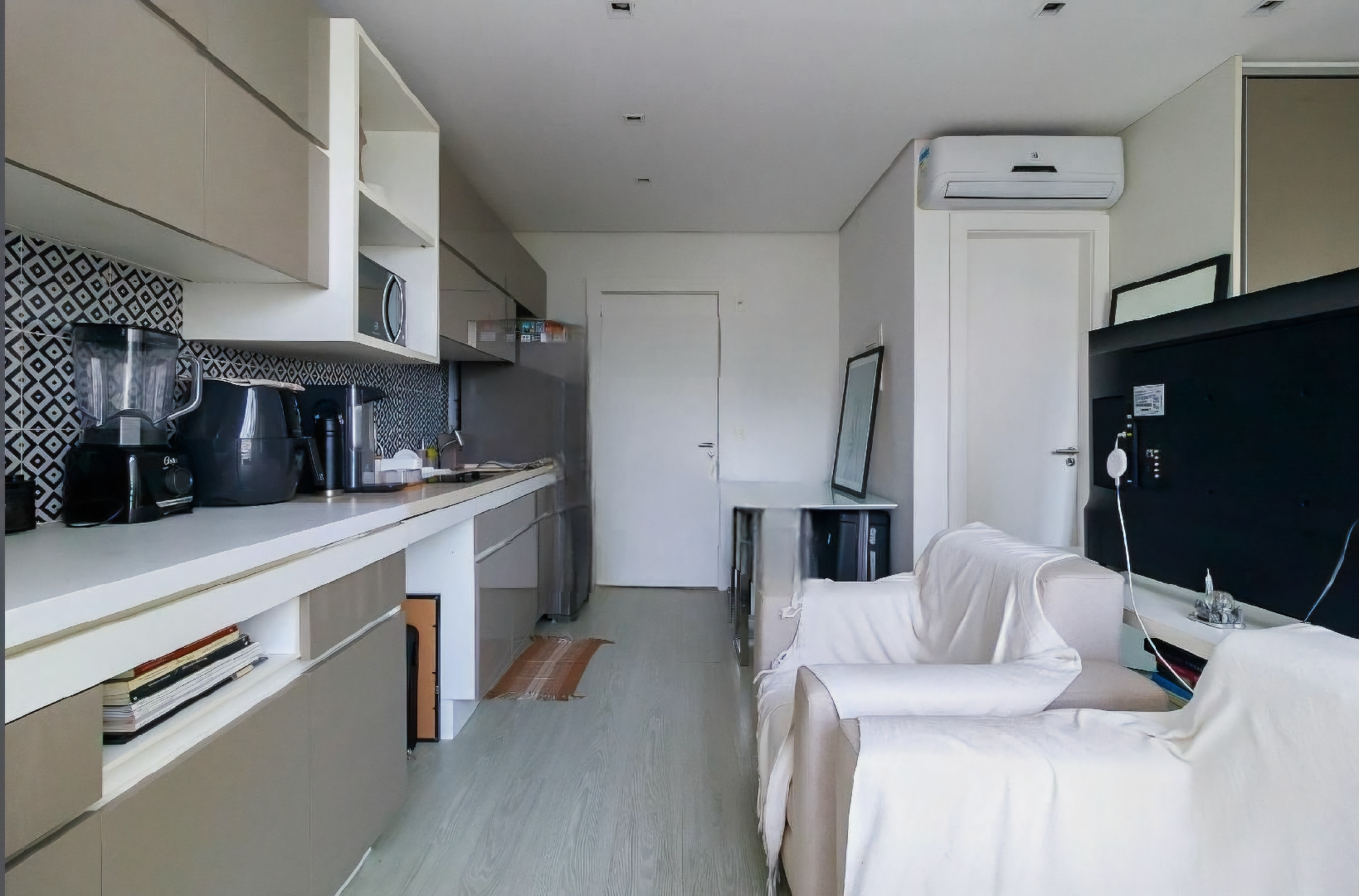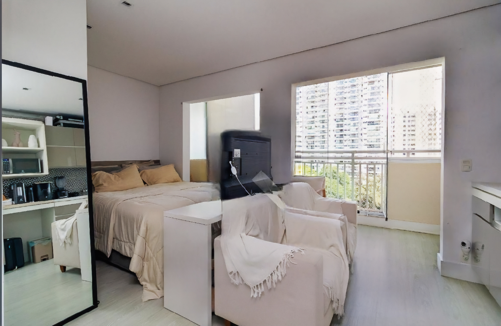 Stúdio com varanda integrada envidraçada equipada com